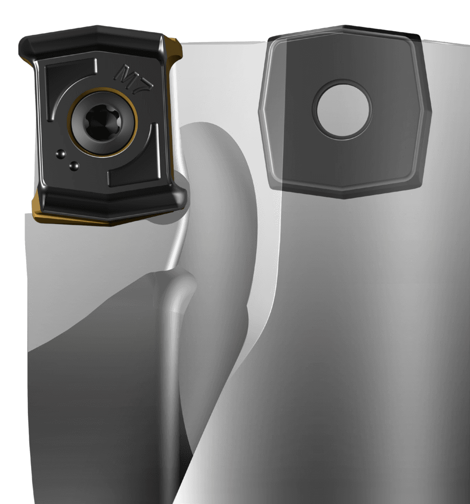Le robuste sedi portainserto hanno tre superfici di contatto e supporto per ridurre lo spostamento dell’inserto. Gli inserti sono robusti e hanno una macroresistenza che assicura una maggiore tenacità e un’insuperabile durata utensile. L’inserto periferico rettificato assicura tolleranza di foro più stretta, prevedibilità e prestazioni costanti.